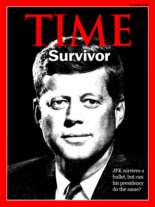 The cover was hand drawn to the correct dimensions using Time’s iconic bright red for the border. The ‘Time’ magazine font is really a font called ‘Amor Serif’ but is not available for free. I used a font called ‘Episode’ to achieve a very similar look. Importantly it didn’t have serif kicks on the top of the M character. I took an original photographic image and really turned up the contrast to wash it out on the stark black background. The original image used was: http://www.knowledgerush.com/wiki_image/7/70/Jfk2.jpg